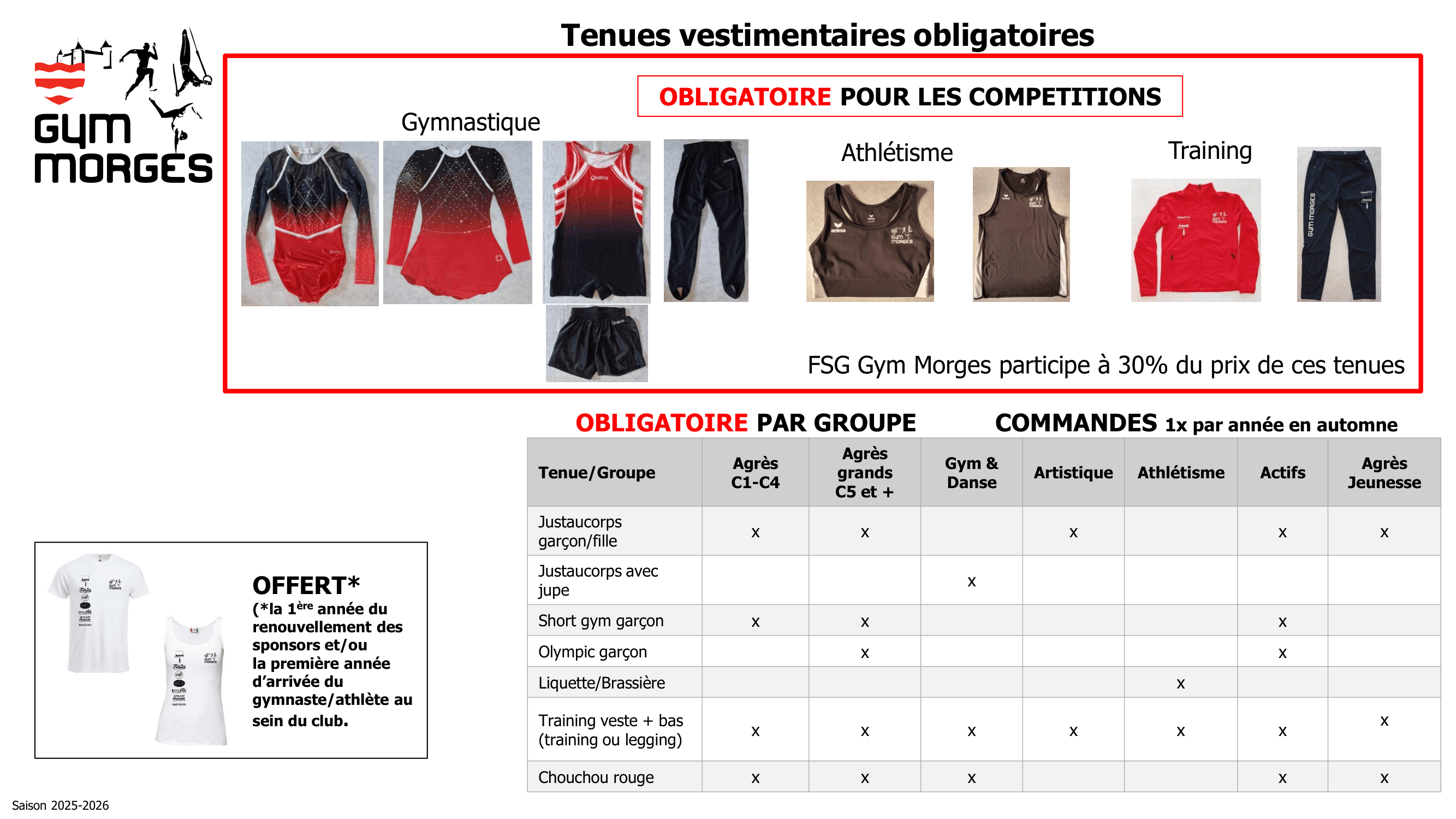 Certaines tenues sont obligatoires pour les groupes Compétition. Vous trouverez toutes les infos sur les tableaux suivants.